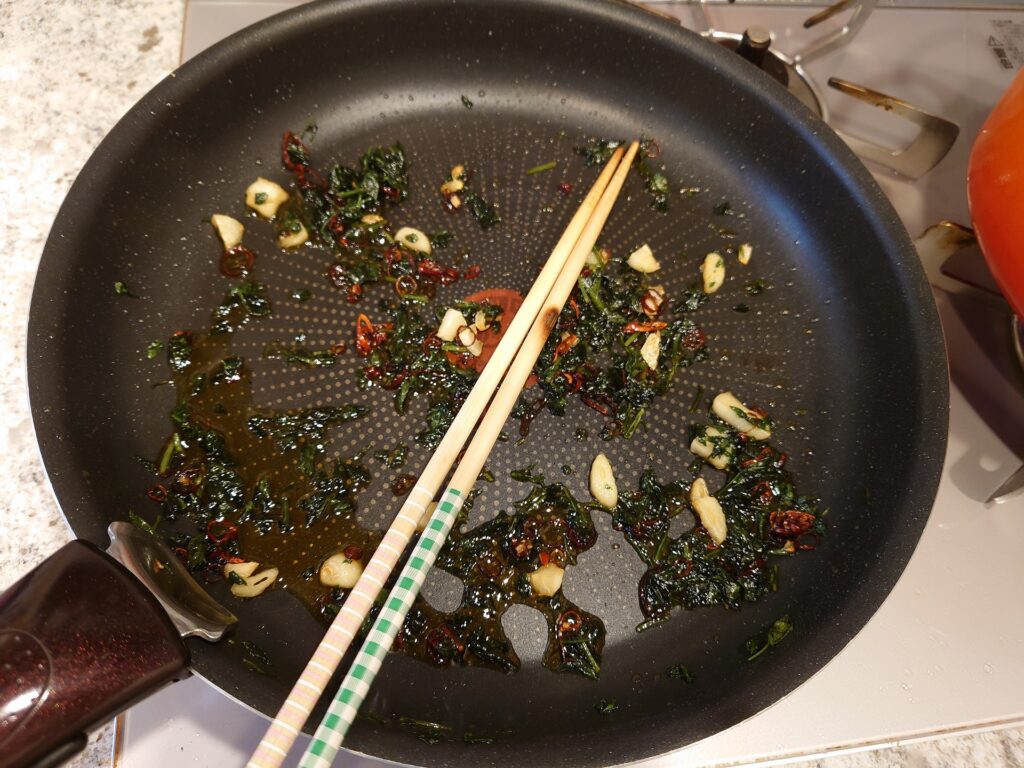 ウチでペペロンチーノに挑戦。 いくつかレシピと動画見て早速調理開始。 ニンニクと今日まで存在すら知らんかったイタリアンパセリなるもの。 フライパンに投入して炒める。 なんかパセリが焦げ気味やけどいい匂いなんでよしとする。 完成! 麺が多めやったせいかなんか味うすい。まずくはないけども。 塩足したら結構マシになった。 次は素直にパスタソース買うわ。